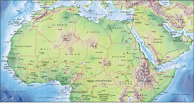 Mountain High Relief Map package of Photoshop JPEG and Illustrator EPS map of Northern Africa continent is a high quality fully editable geopolitical relief and vector map in Lambert's equal-area projection and is supplied with a comprehensive set of layers of editable features and names. JPEG Relief maps and EPS Vector maps can be easily and quickly loaded into desktop design, publishing, presentation apps for the highest quality geographical representation. At 300 dpi this maps measures 10.97 x 5.79 inches and a pixel size of 3290 x 1736. Map resolution is 2500 meters per pixel.